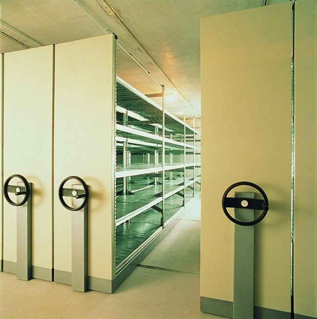 На этой фотографии показан пример установки 4-х стеллажей длиной 1500 мм на 6-метровой платформе. Максимально возможная нагрузка на платформу до 6 т. Редуктор с передаточным числом 1:4,5 позволяет легко передвигать эти платформы, освобождая рабочий проход в нужном месте. В 2003 г. нами поставлены и смонтированы платформы для Государственного Комитета Экспортного контроля, в 2005 г.- для Национального Комитета Регулирования Электроэнергии, в ноябре 2007 г. – для ПИИ «Позитрон Gmbh» (г.Желтые Воды).